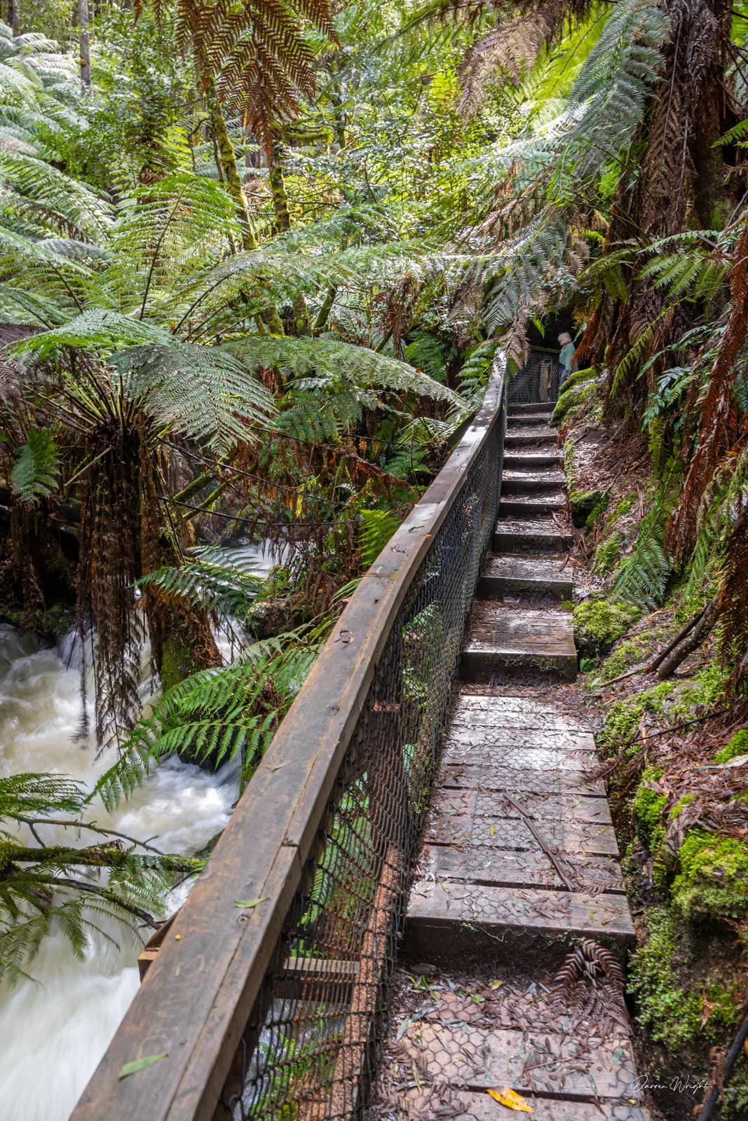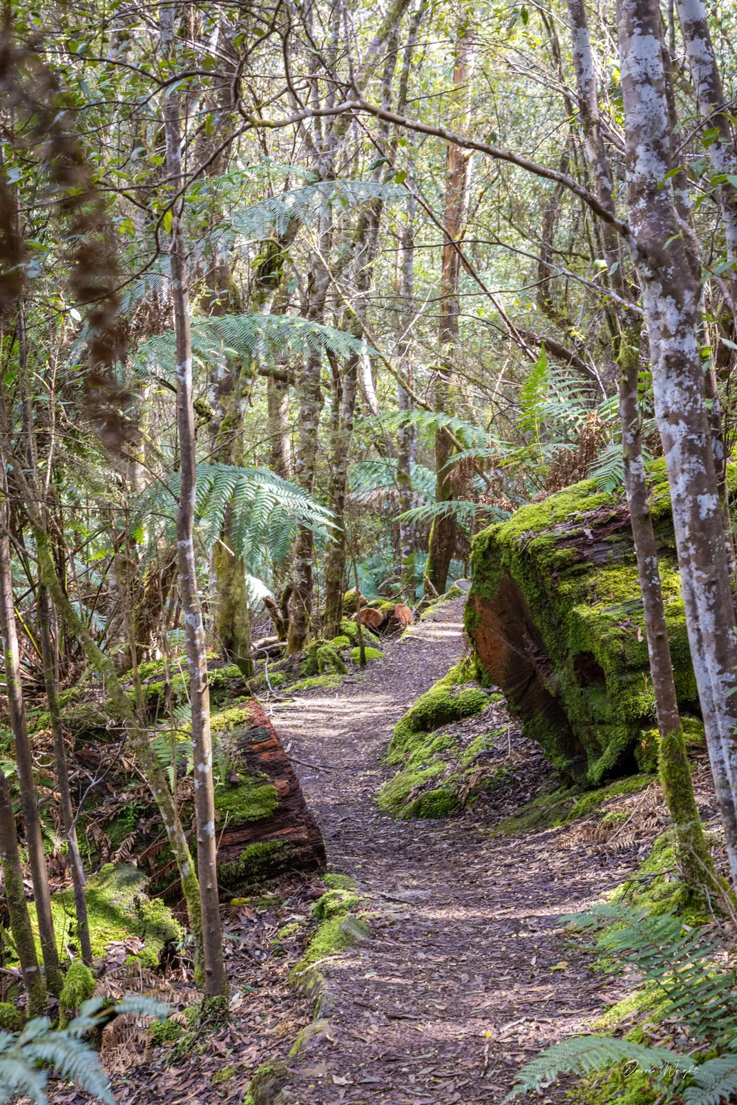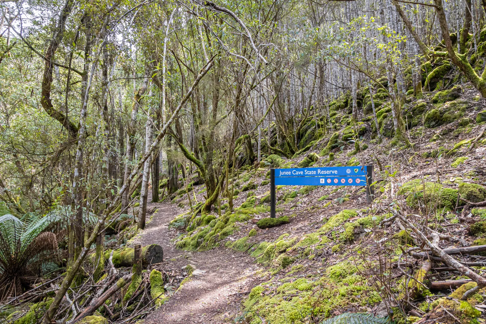 The Junee Caves Track near Maydena in Tasmania’s Derwent Valley is a short rainforest walk that follows the Junee River to the entrance of its karst cave system.