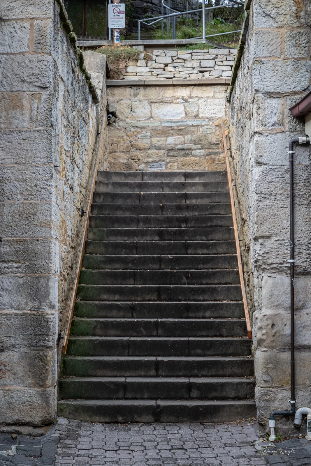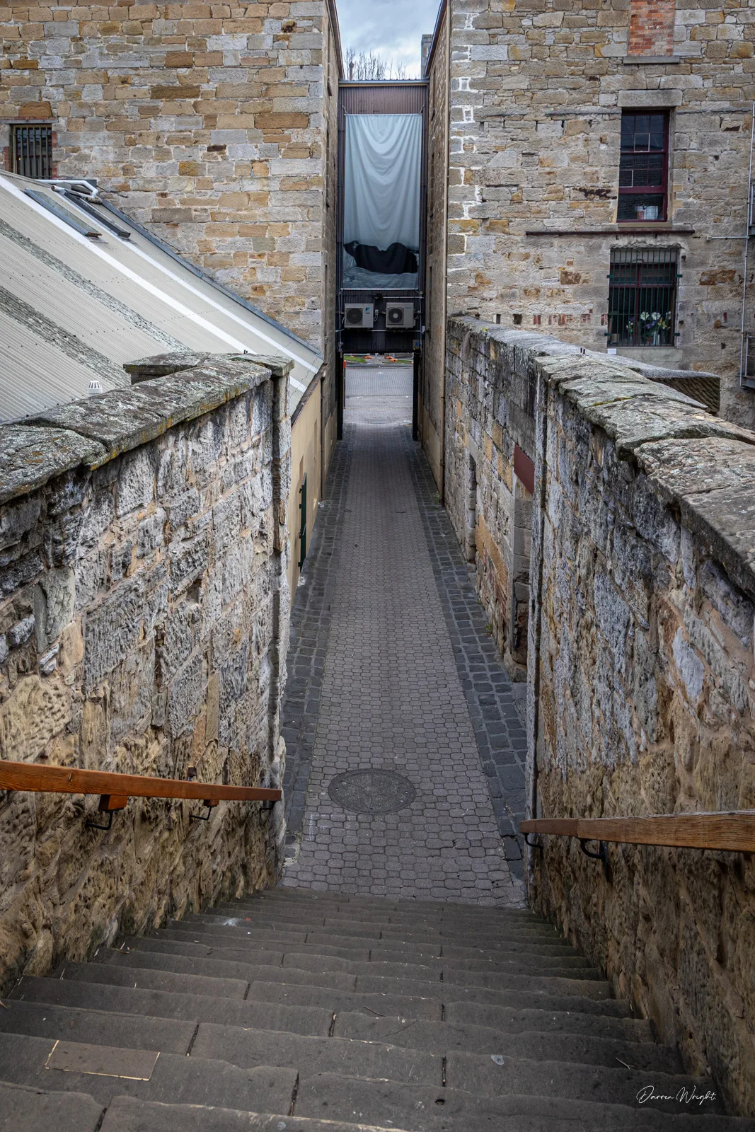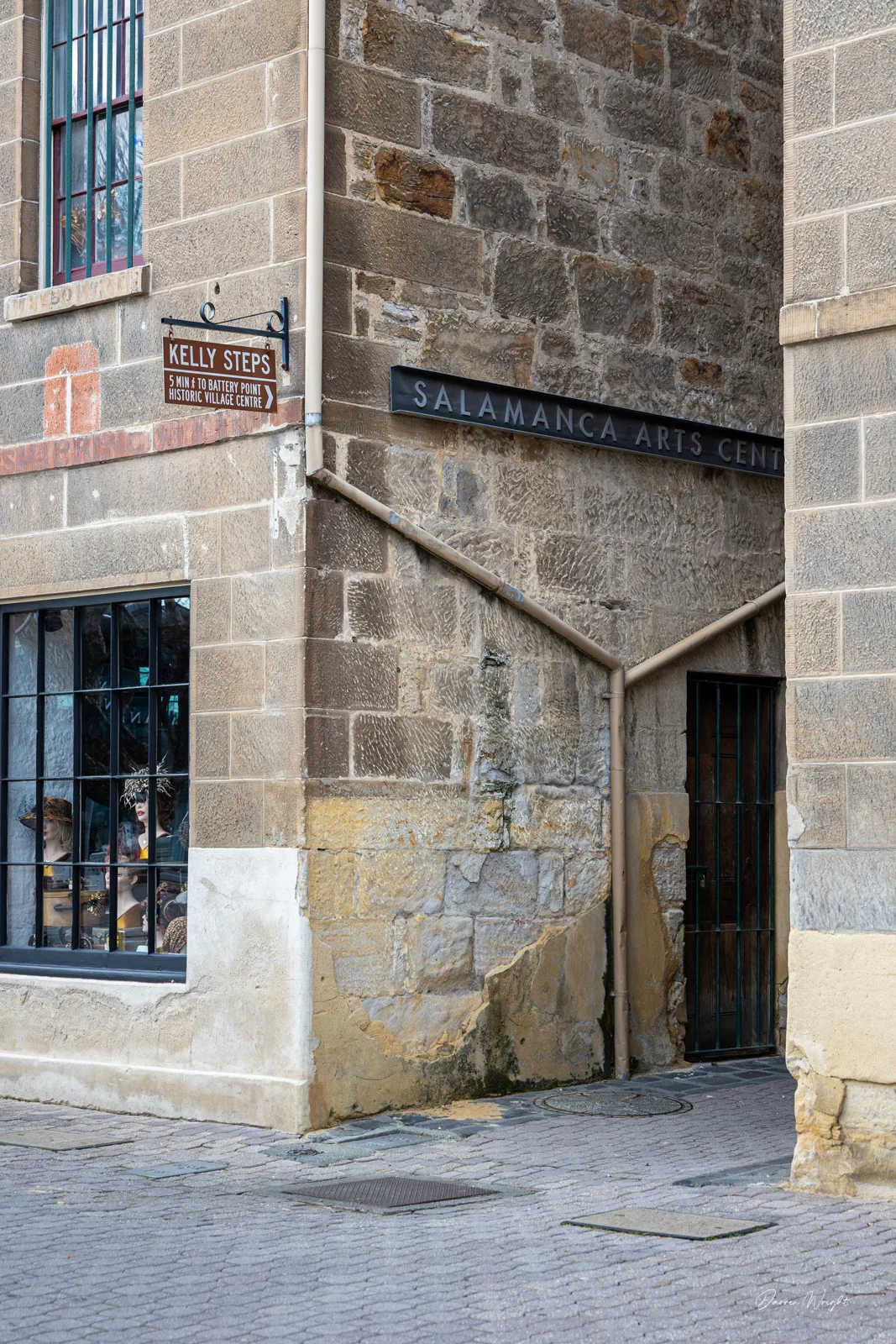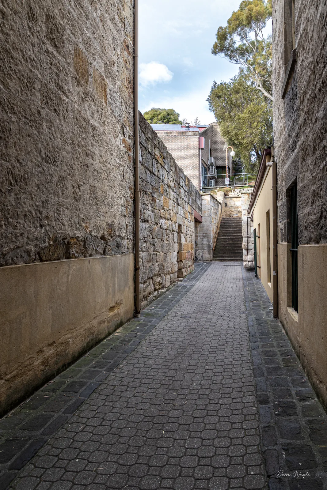There’s a strong visual contrast here—the clean vertical rise of the steps set between two rugged stone walls, and the shift in pace as you move from the busy precinct of Salamanca to the quieter heritage cottages at the top. It’s more laneway than lookout, which makes the light a little tricky—early and late in the day, the shadows can be harsh, but during overcast conditions or soft midday light, the textures really come alive.